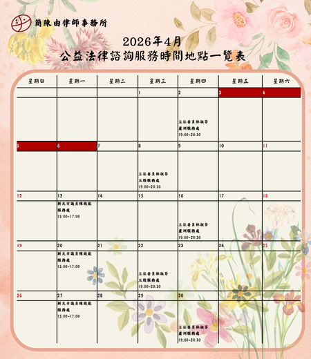 2026年4月份公益法律諮詢服務時間地點一覽表最新消息 ▸新北市議員陳啟能服務處: 新北市三重區龍濱路219巷43號(近捷運三重國小站) (02)2978-4978 ▸立法委員林淑芬五股服務處:設定精選圖片 新北市五股區民義路一段37號 (02)2291-2995 ▸立法委員林淑芬蘆洲服務處: 新北市蘆洲區長興路25號 (02)8285-6412 #簡律師諮詢時間地點以行事曆公告為主 #新北市議員李余典喬遷至三重商工正對面 上一 文章 2026年3月份公益法律諮詢服務時間地點一覽表